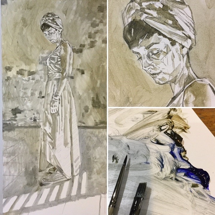 Step One: The process began with a set of photographs in my earthquake damaged studio. The temperature was hitting 40 degrees every day but I had great light in the space which I could moderate with slatted shutters. Whilst playing around with different poses and situations there was a moment when the light through the shutters hit her dress, she was turned away from the light but still caught in it. In her pose she looks down in contemplation but is clothed in colour. The sadness and hopefulness came together in that moment and I knew that would be the composition for my painting. Having recorded the moment in a photograph, the next decision is which canvas . I like to paint heads at a certain size - around 5 to 8 inches - and I knew that the full figure needed to be represented in the whole space so I opted for one of the large deep edge Cass Art canvases at 80 x 100cm.